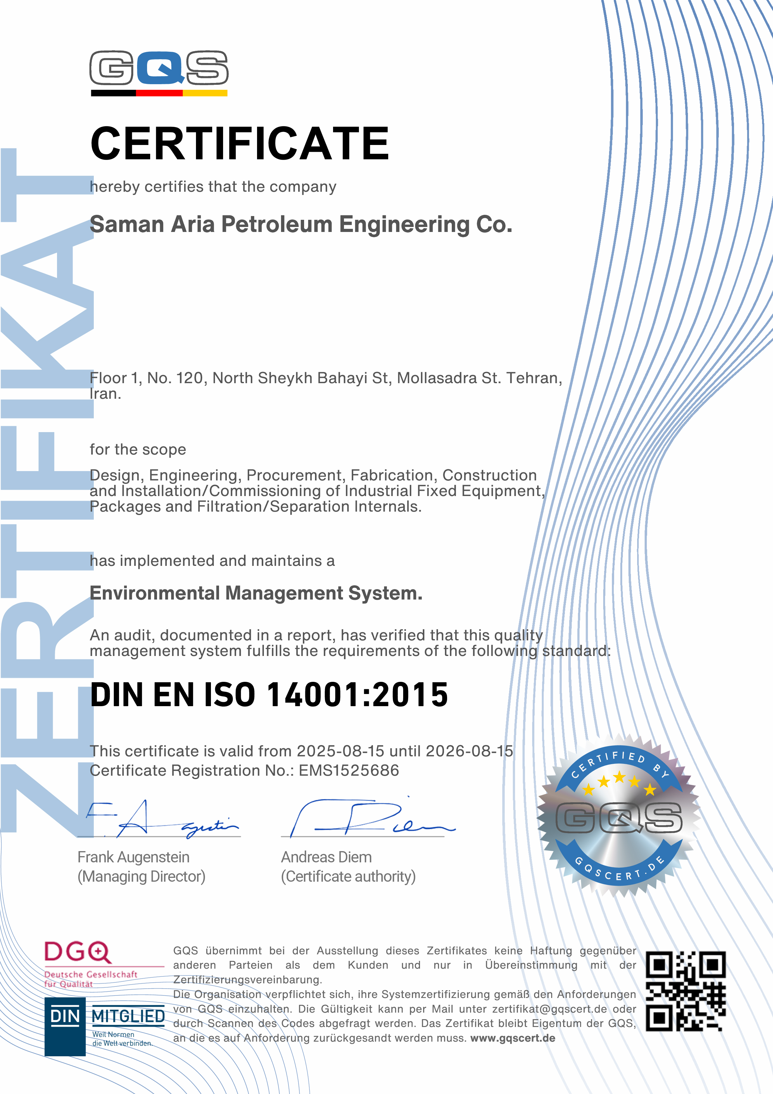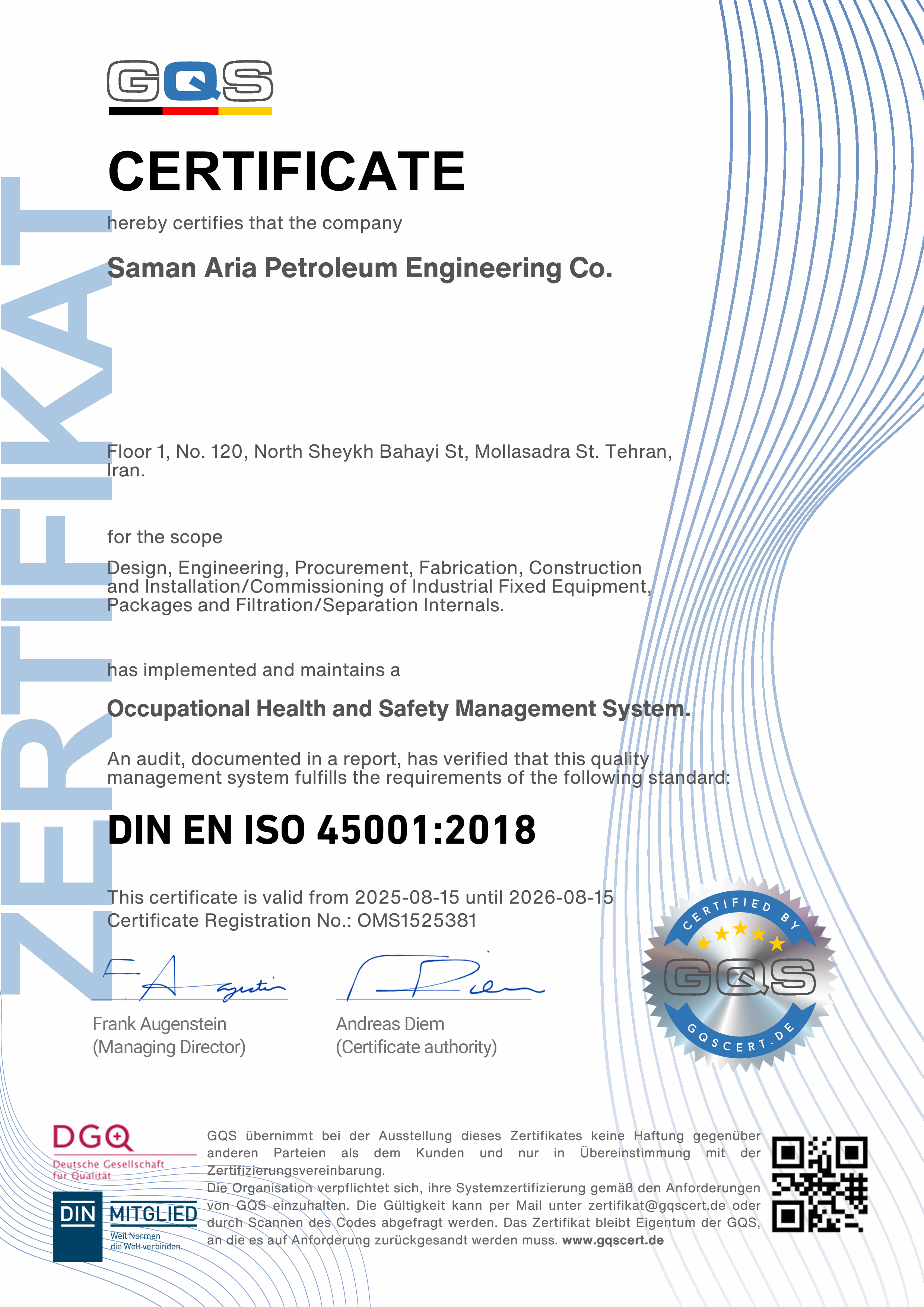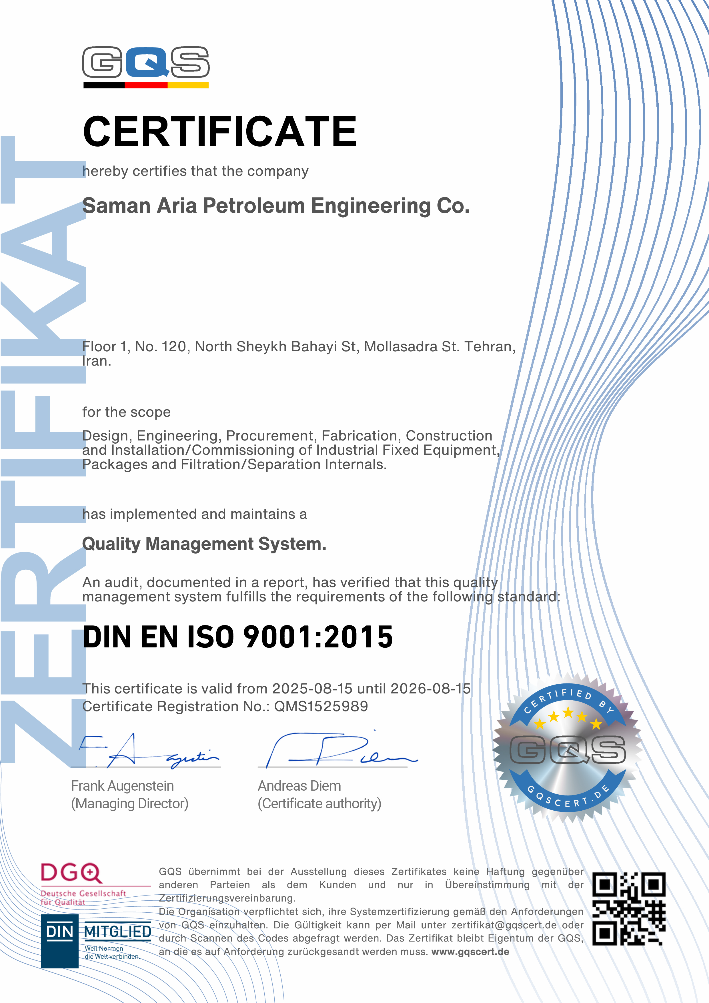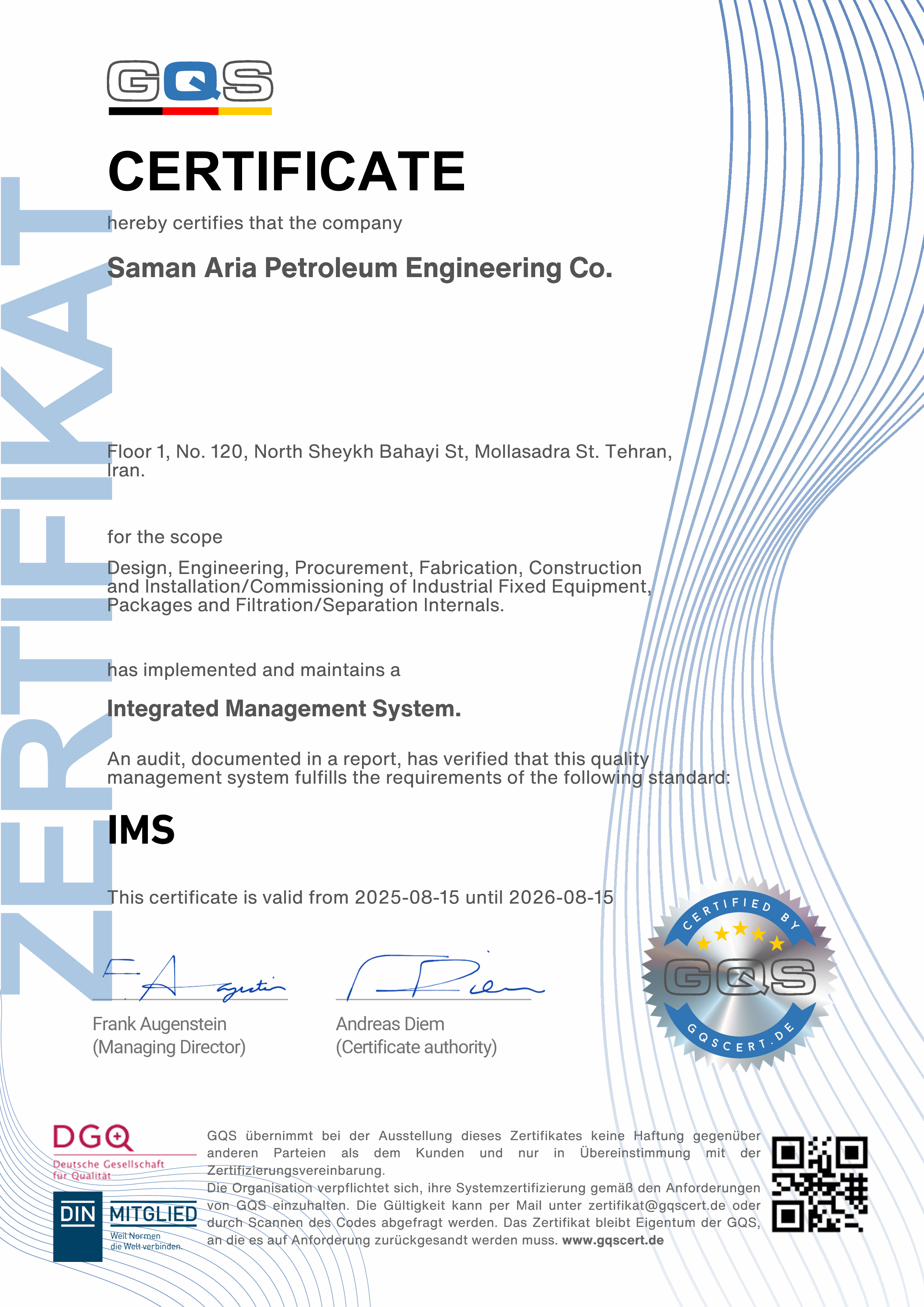 شرکت مهندسی سامان آريا پتروليوم توانسته است با پيشاده سازی دقيق هر يک از الزامات مديريتی در جهت ارتقاء راندمان فعاليت های گام بردارد و پس از ممیزی های دقيق و سختگيرانه موفق به اخذ گواهينامه ISO 9001 گرديده است. پياده سازی ساير استانداردهای زير نيز در دست اجرا می باشد.